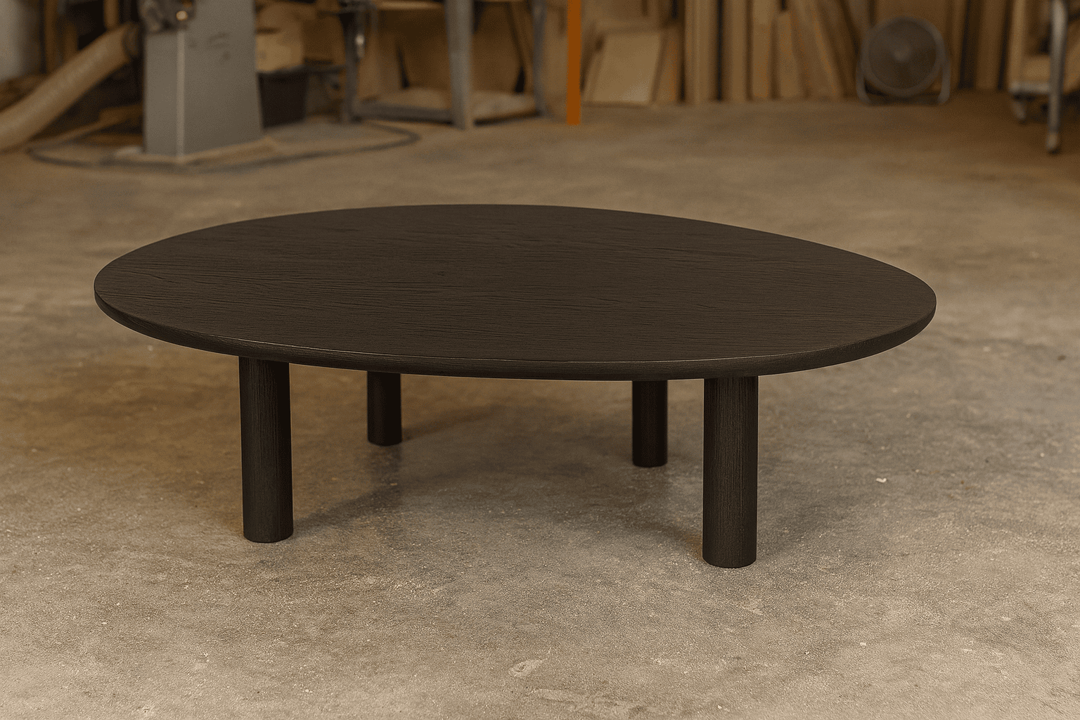 Minimal oval coffee table in black veneer, customisable in size and finish.