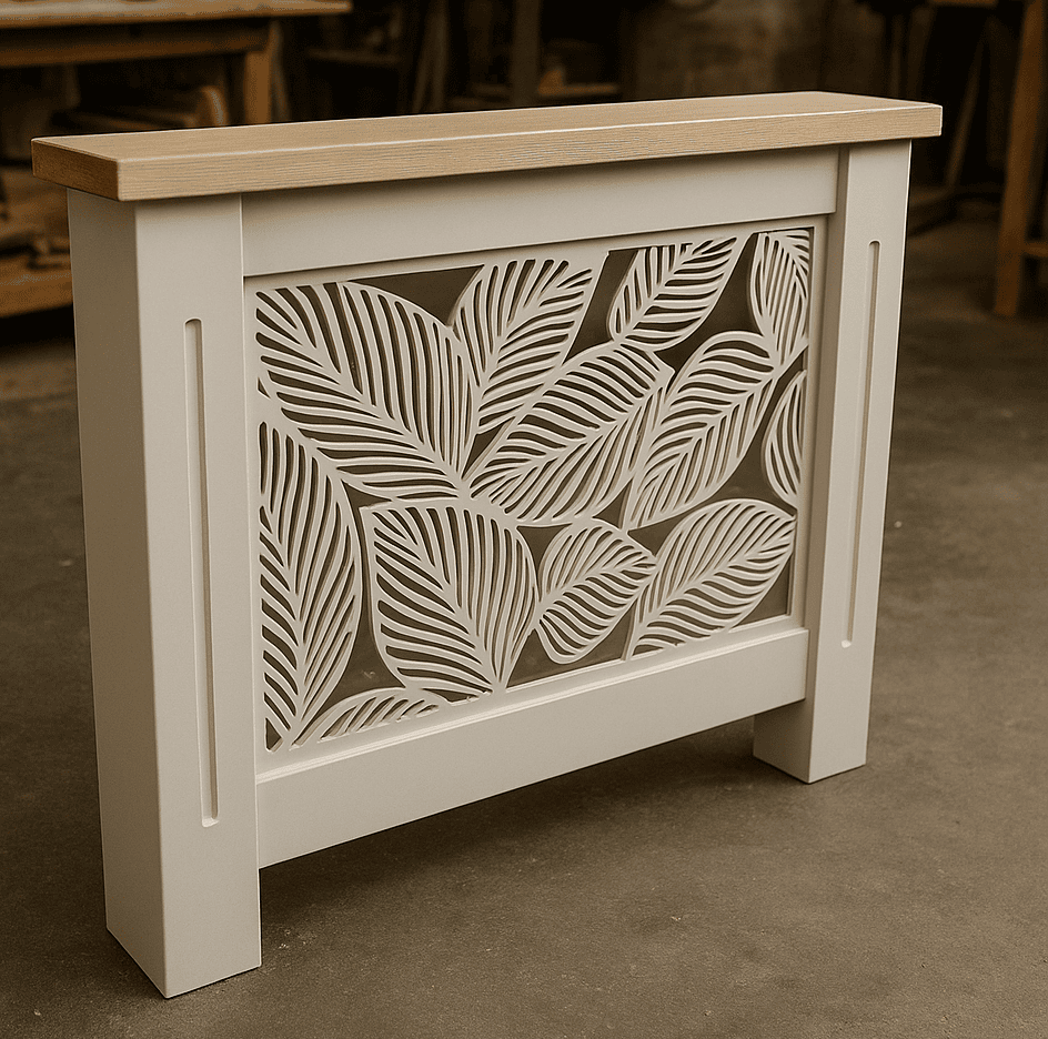 Made to measure radiator cover with decorative panel and solid oak top, fully customisable.